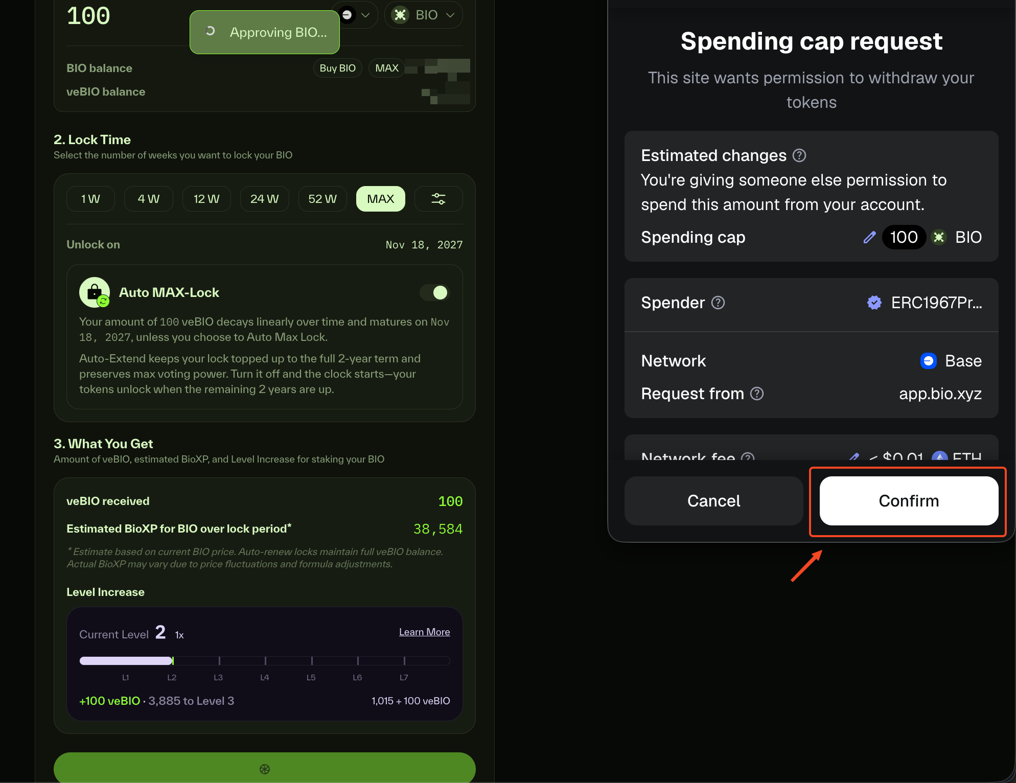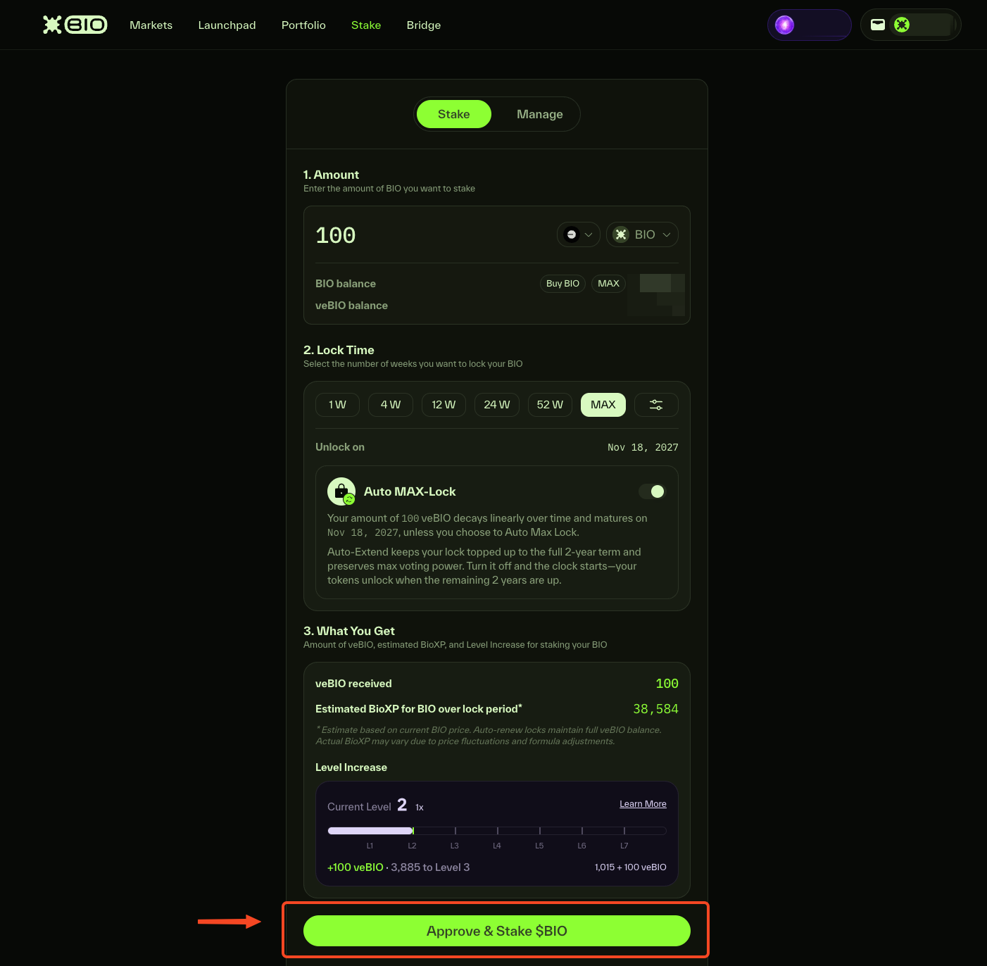 4. Enter the amount you want to stake and choose lock duration. Click “Approve & Stake $BIO”.