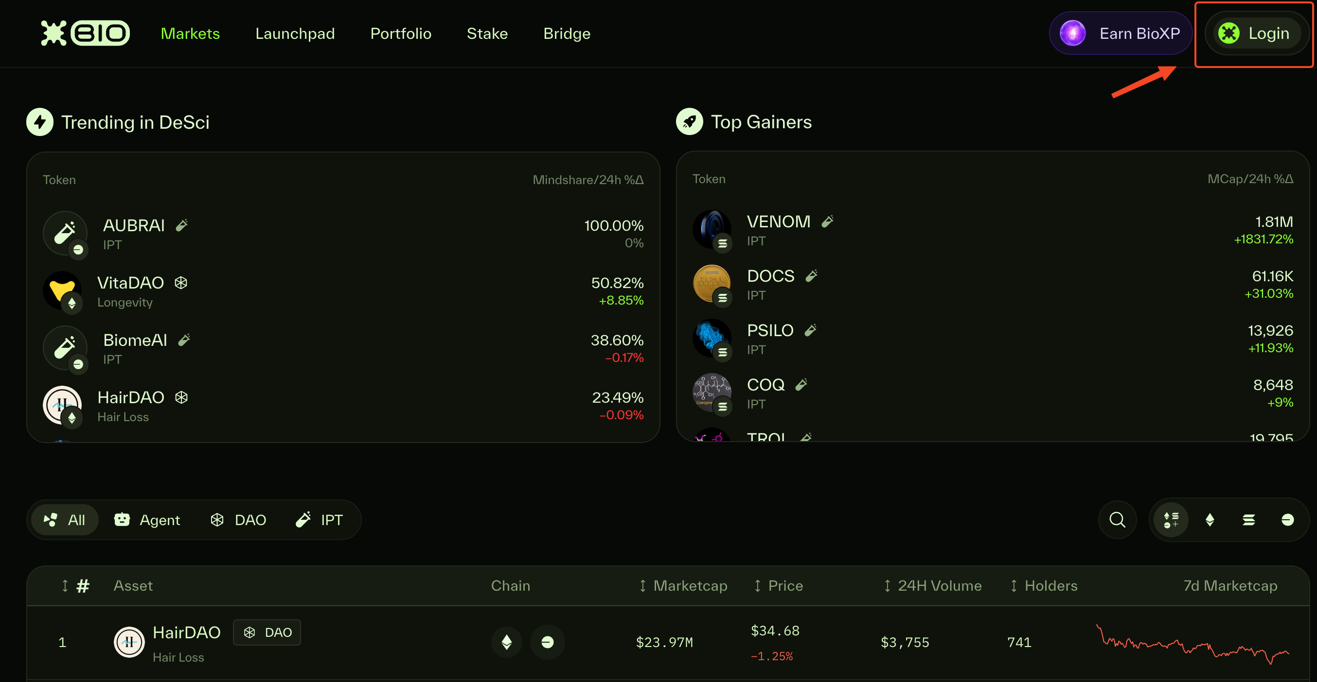 1. Navigate to the [Bio App](https://app.bio.xyz) and login to your wallet in the top right corner of the screen. Click the button “login”.